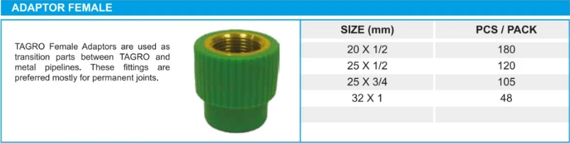 TAGRO Female Adaptors are used as transition parts between TAGRO and metal pipelines. These fittings are preferred mostly for permanent joints - High temperature & pressure resistance Corrosion-free & non-toxic - Easy installation with fusion welding.