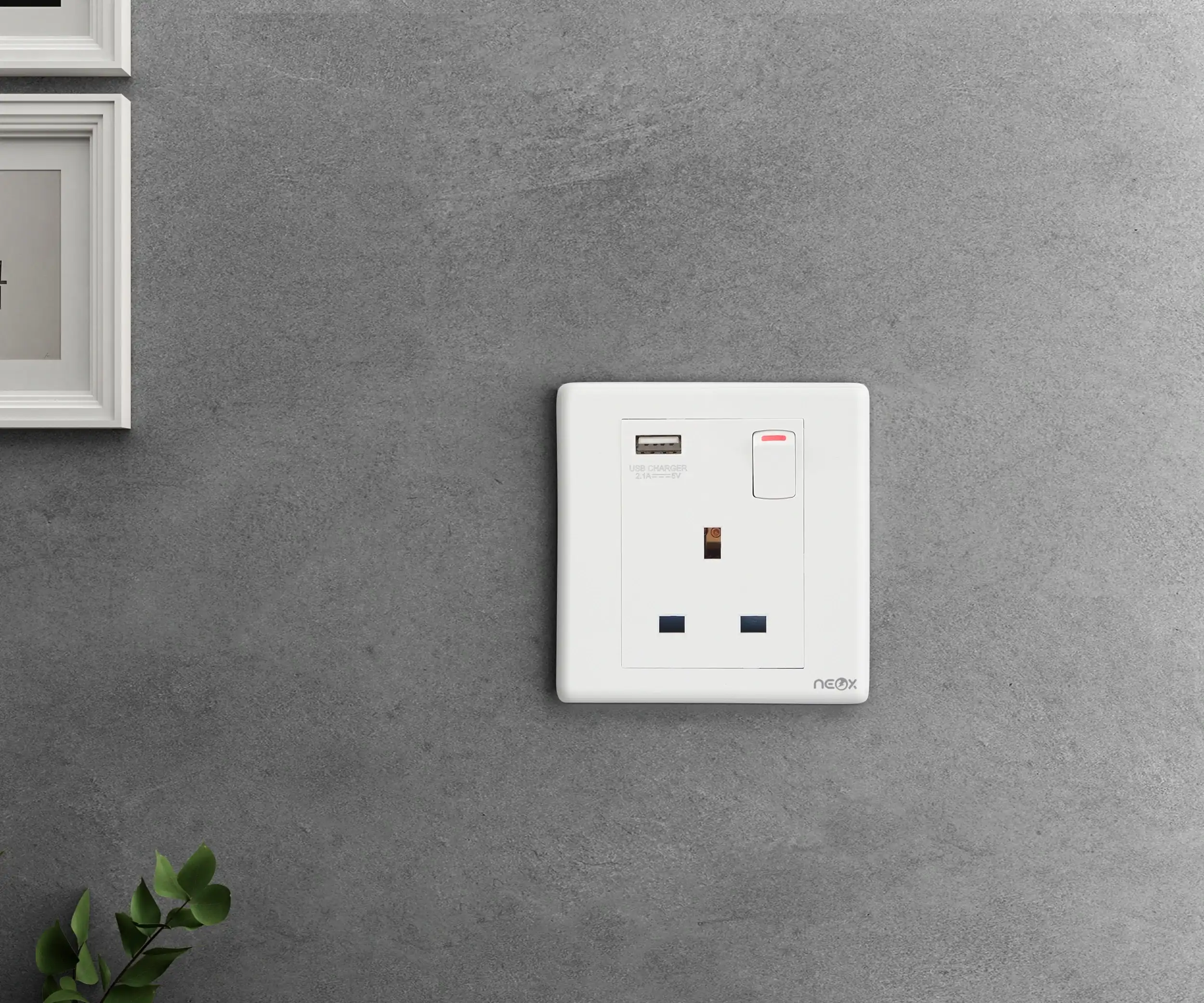 NEOX 1 Gang Switched Socket with USB Charging Port, 5V, 2.1A USB, 250V, 13A, Material: Pc Panel & St-543CMX